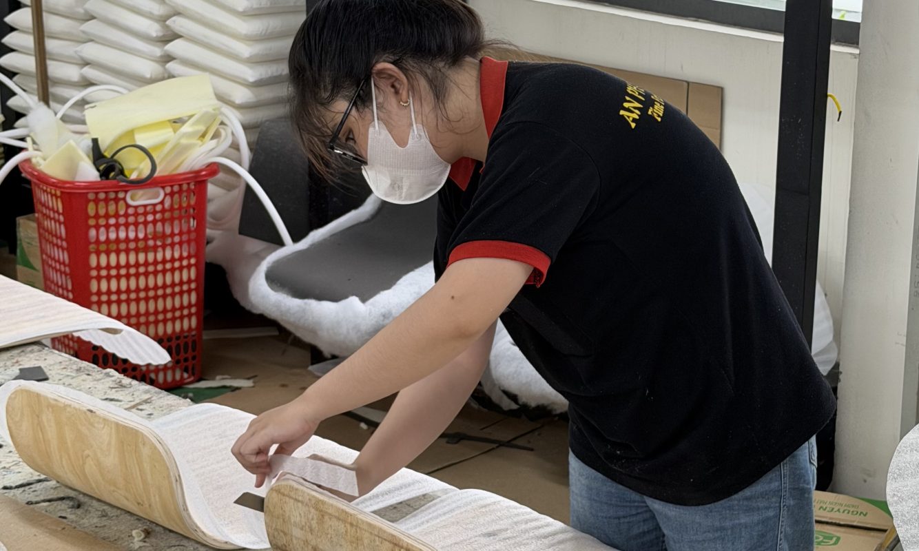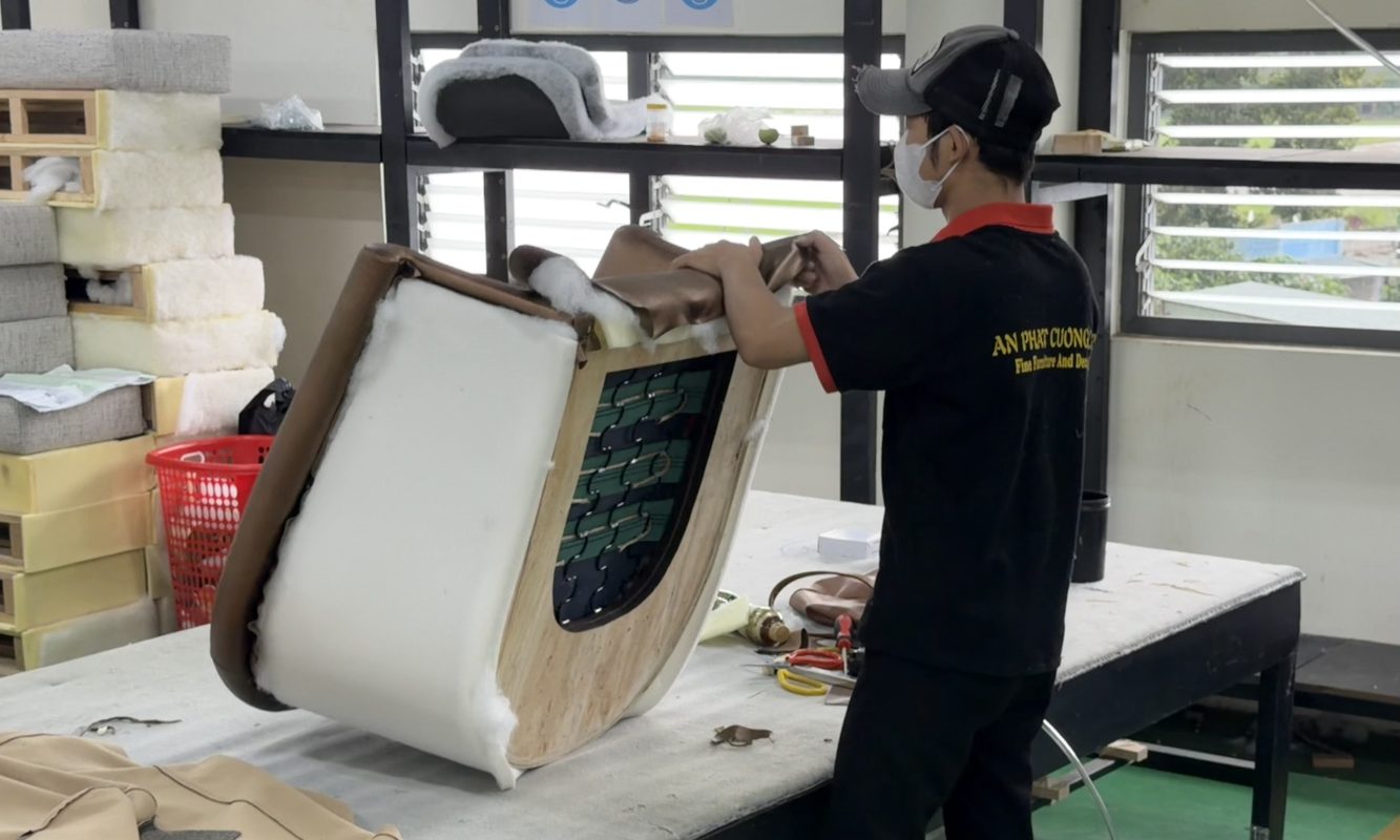 Once the frames are completed, foam is cut to precise dimensions and carefully applied to each product. This step shapes the furniture, adding comfort and enhancing durability for long-lasting use.